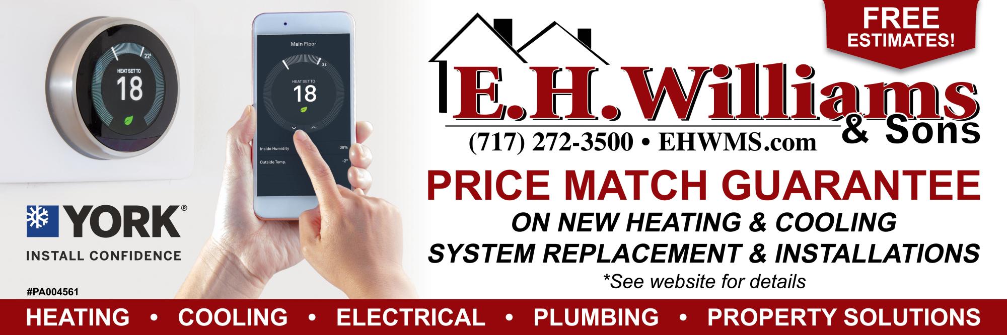 Customer must supply a original competitor estimate. EHWMS will provide a comparable estimate of equal or better pricing. EHWMS Reserves the right to turn down any request for pricing or price match guarantee request. EHWMS will use comparable or equal efficiency, sizing and quality. Brand / Manufacturers may vary. Price match guarantee is limited to new equipment only, excludes Service / repairs. All work to performed during regular business hours. Product manufactures, warranties and lead times may differ from competitor estimates. 1 year EHWMS workmanship warranty on installed materials. Standard manufactures limited parts warranties apply. Warranties will be voided due to neglected regularly scheduled service/maintnance . 50% on signing and 50% at time of service unless otherwise stated. 3% credit card processing fee. Manufacturer limited parts warranties apply. Revised estimate will be completed if equipment is to be ordered more than 30 days after estimate date. No warranty on customer provided materials. Unexpected equipment price increase may apply. Scheduling and equipment order/hold with down payment. Discounts to not apply to estimated projects unless otherwise noted.1 Yr. EHMWS workmanship labor warranty with EHWMS provided equipment. PA Contractor Number #PA004561